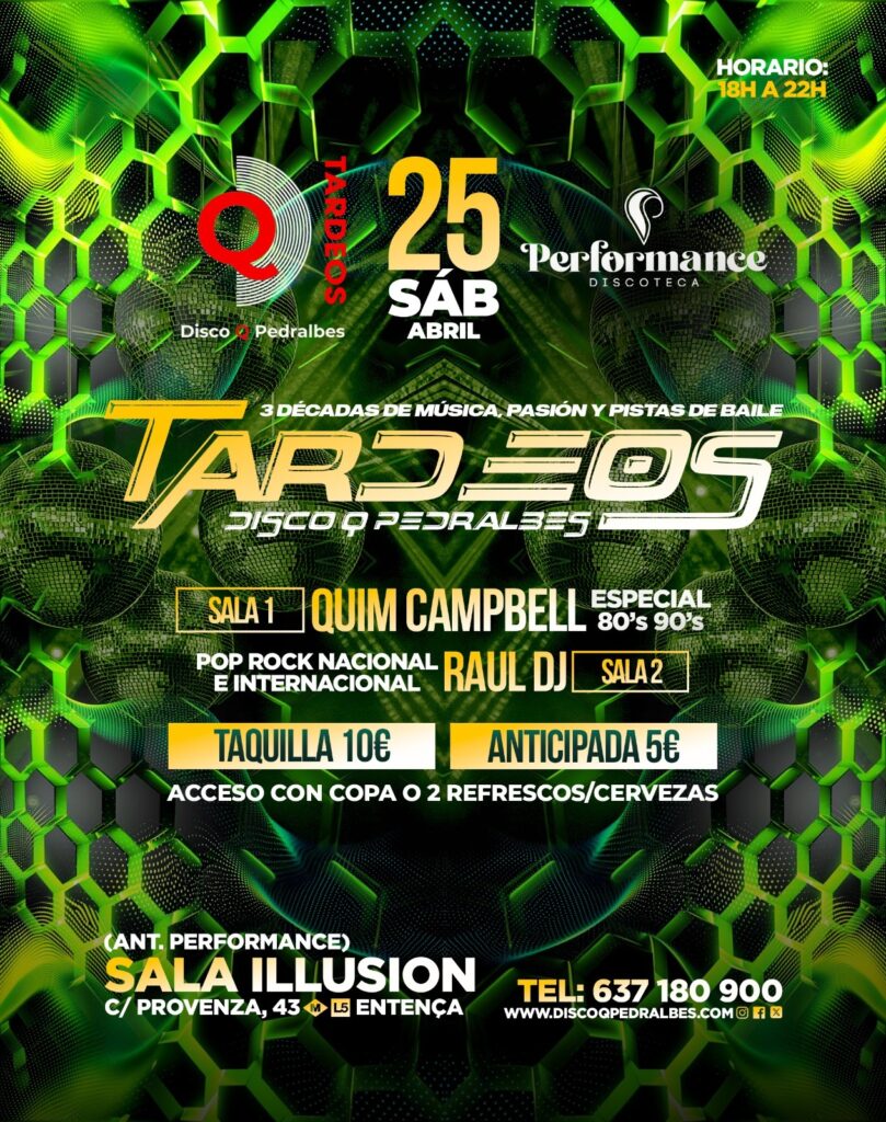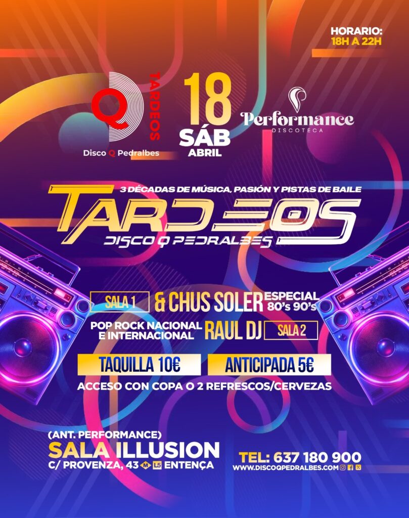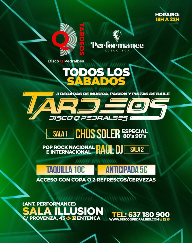 🎉 TARDEOS TODOS LOS SÁBADOS📍 Sala Illusion (antes Performance)C/ Provença, 43 – Barcelona🕕 De 18:00 a 22:00 h💃 Dos ambientes musicales para no parar de bailar:✨ Los mejores hits de […]